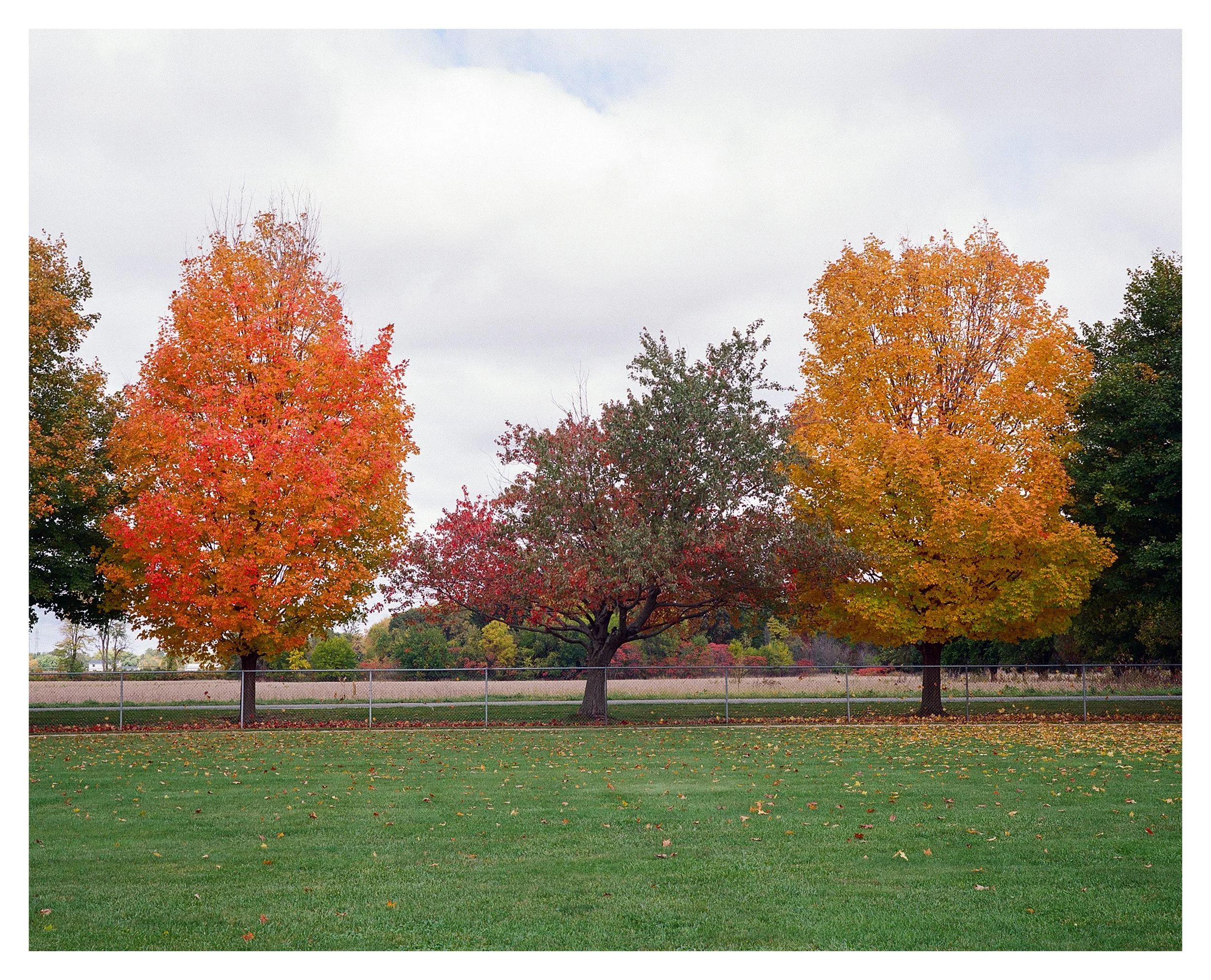 By this time Malia had joined me again, and we took a stroll around the adjacent park, taking in the fresh air and enjoying each other's company. Here I found my last great photo for the day—a set of three trees clustered together, each with a different color of leaves. A straight-on composition made the most sense here, as everything from the trees to the fence to the path run in parallel across the frame. The foreground of neat, trimmed grass and evenly scattered leaves helps accentuate the different shapes and colors of the trees, forming an pleasingly simple foundation upon which I placed my subjects. Here I was presented, as I was at the lake, with beauty in its raw form, ready to be guided towards a particular purpose, and this time I met the challenge, even if it was an easy one (there are only so many ways I can think to compose this scene, although individual verticals of each of the trees might have been nice). Either way I am happy for that moment and for the whole day, even the times that I didn't get the photos I wanted; the worthwhile pursuit is to meet those challenges head-on, unafraid to try things out and fail if need be. I still came away from that day empowered, still felt the drive to create more and more, and so I have no qualms about stating confidently that it was a great experience and another good piece of that whirlwind of a week!