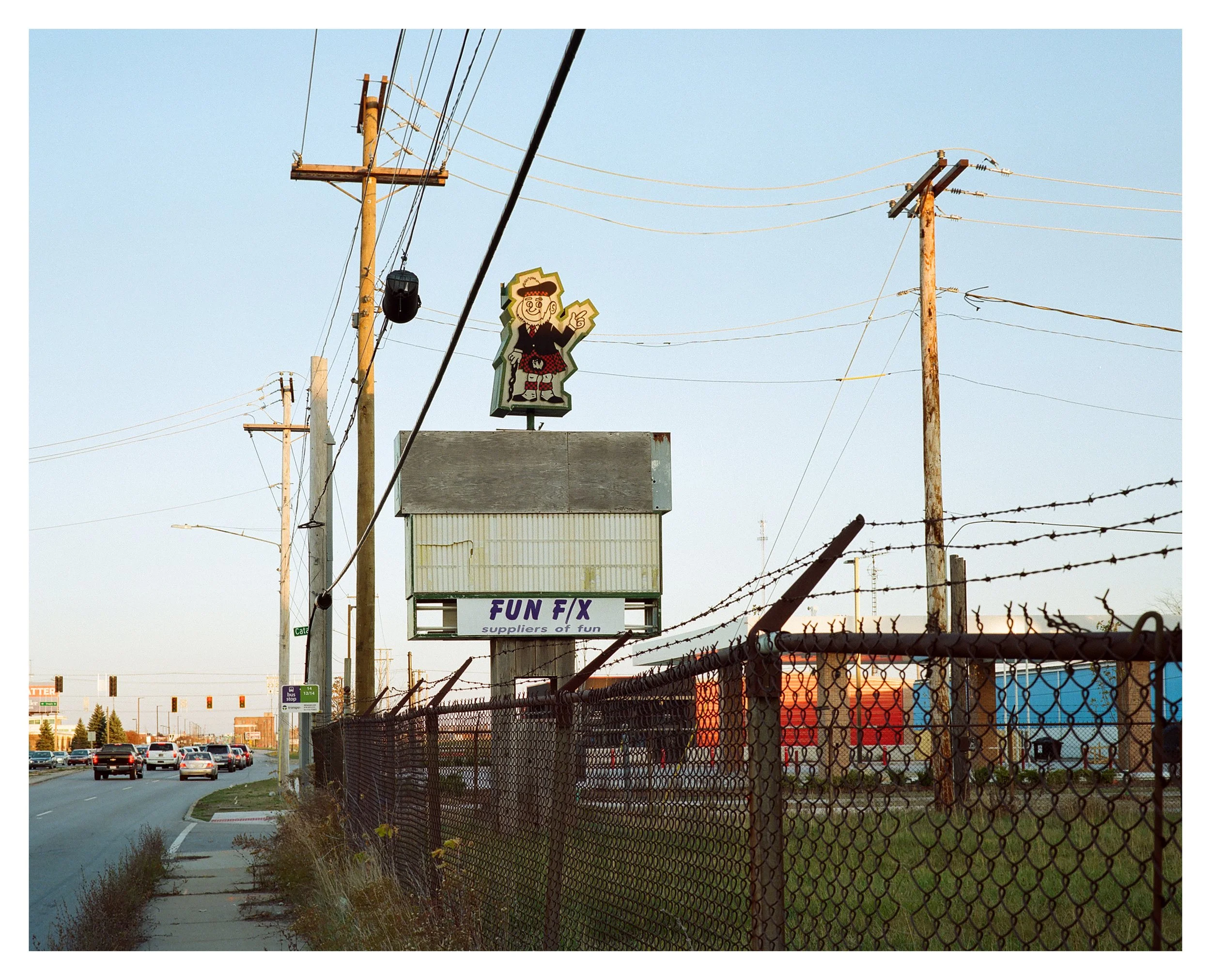 That evening, presented with the potential of a mostly unshot roll of film, I made my way to Sample Street to photograph the old Fun F/X sign, once again on the recommendation of Jesus. I honestly don't know how I had missed seeing this sign before, as I've been to Sample many times over the past few years, even shooting one of my early medium format photos at the blue building that appears in the background of this shot. I am happy, though, that I ended up here at this particular moment, as the dying embers of sunlight provide just the right amount of lighting for this scene, illuminating the very top of the sign. There's a good division in the composition between the still-bright sky and the ground that lies in shadow, reinforced by my subframing which places the sign inside of a box made by power lines and telephone poles. I enjoy the metaphor of the sun setting, possibly for the final time, on this old business, leaving behind a darkened shadow of what it used to be, caged by the growth around it. Although my fears that the sign would be torn down in the near future proved unfounded, I am no longer worried about that possibility, as I have recorded the scene to my satisfaction, preserving the beauty and the decay of my subject as I saw it!