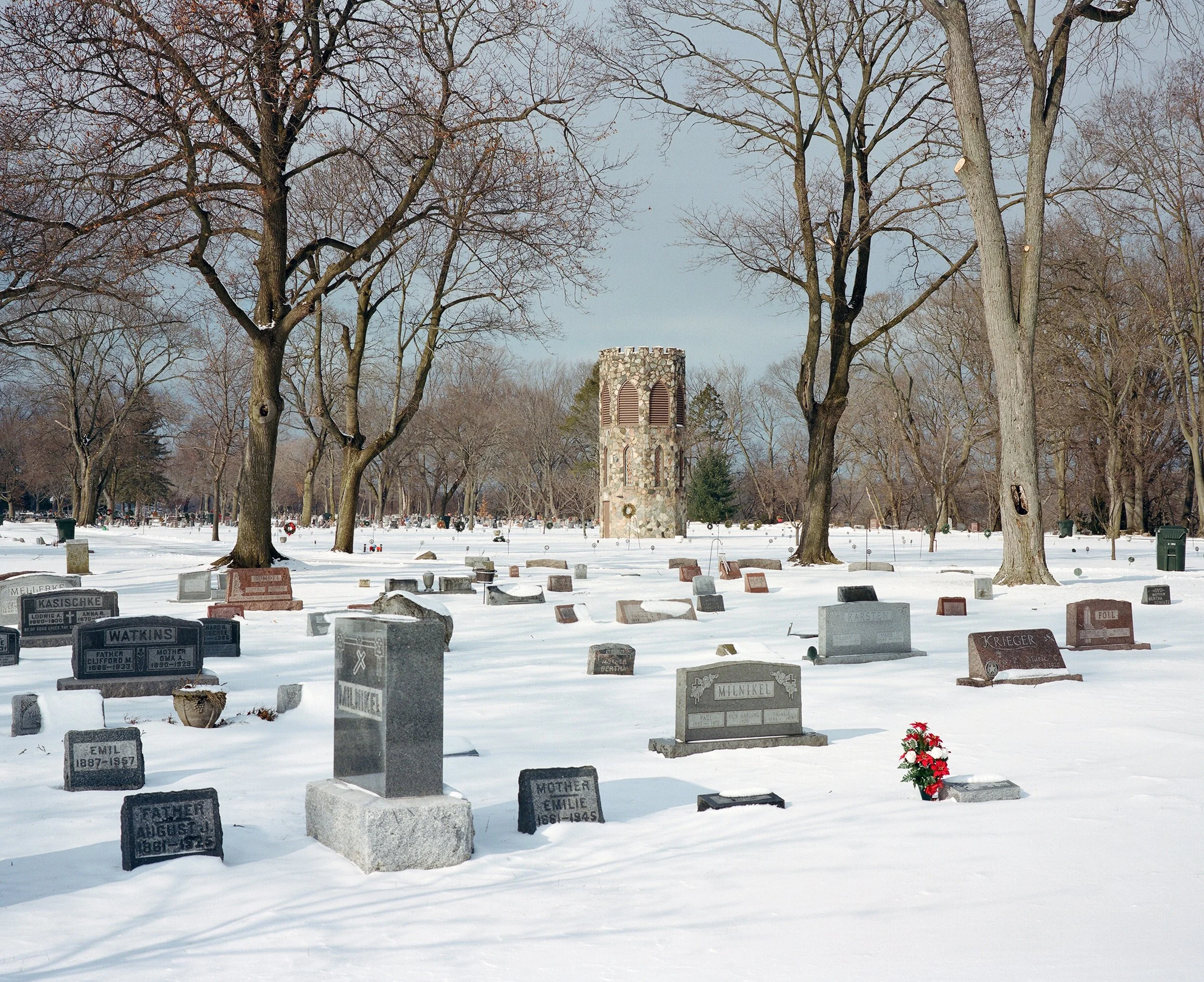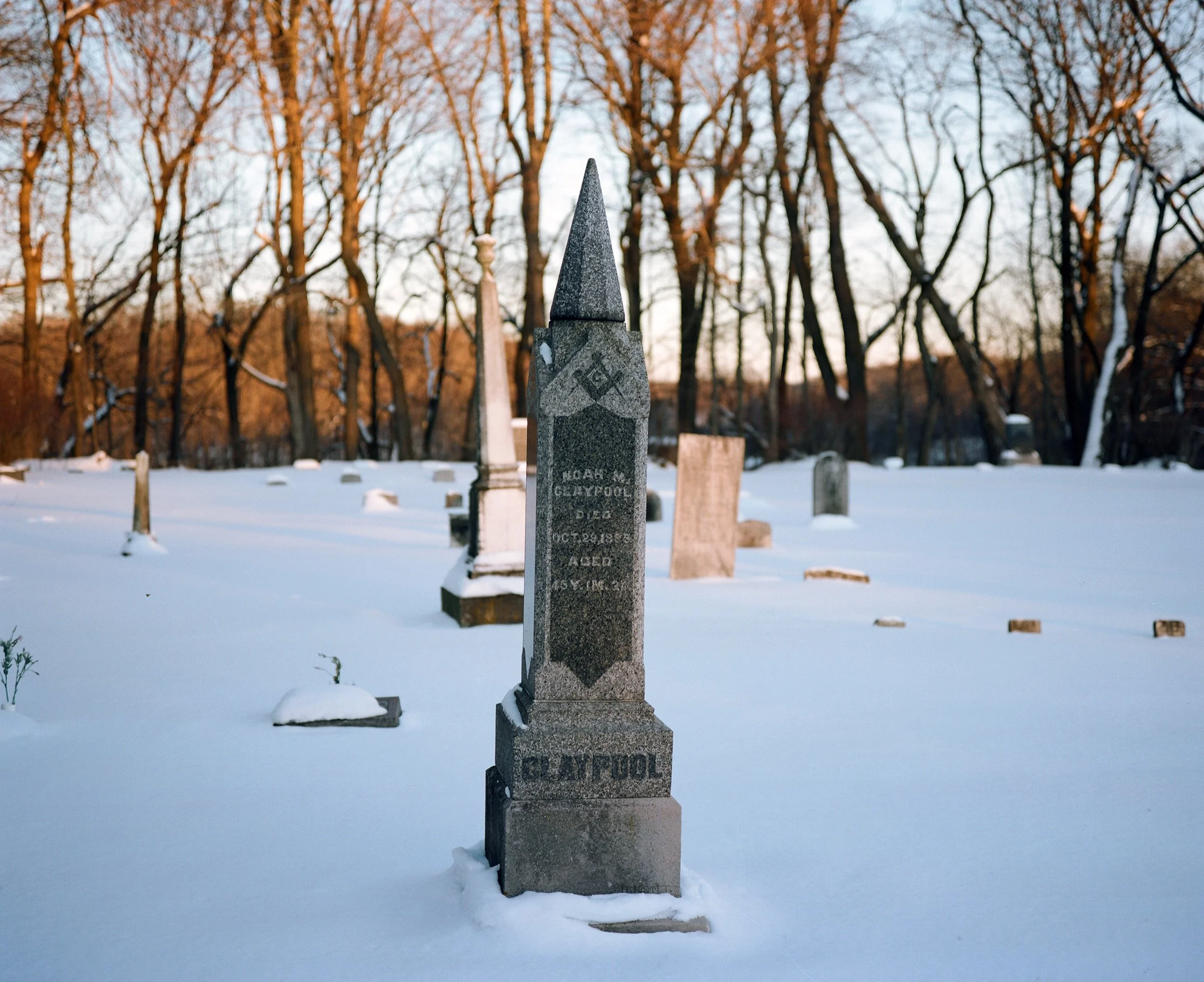 However, I quickly encountered a problem: after taking seven photos, the shutter lever got stuck and would not move, or let me fire the shutter to clear it. Unsure about what to do, and losing light, I chose to call it a day and go home to figure this out. When I got home, I finally popped the back open, partially burning the last couple shots, and managed to get the winder to work again, finishing off the roll by firing into nothing. This left me shaken of course; not only did I lose five images, but had I done something wrong with the camera? Or maybe the cold had something to do with it? The natural thing to do, then, was to take it out again and see if things went the same! On Saturday afternoon, then, I headed out towards St. Joseph to try a roll of Portra 400. I first stopped at Riverview Cemetery, a place I had passed hundreds of times, and I shot a couple photos there. The sun had come out, and the snow was glistening wonderfully around the headstones. I am unsure what the tower in the center of this photo was supposed to be, but it made a natural focal point, especially framed by the trees around it!