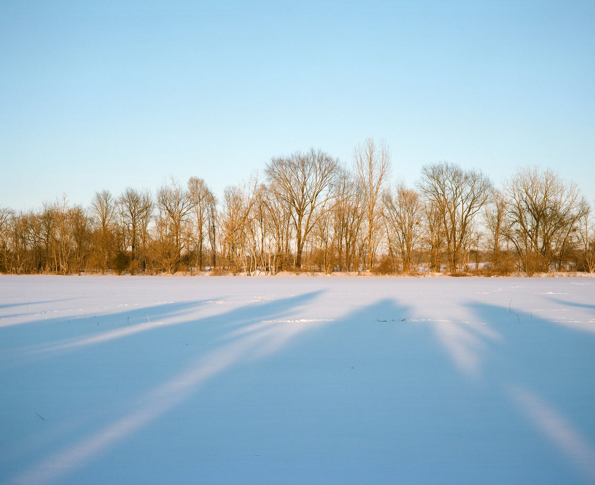 Next, I drove along 139 (or Old 31 as the locals call it) until I was past Niles, where there are some big open fields, which that day were covered in crisp, uniform snow. I stopped on the side of the road (something that my friend Jesus has pushed me to do, so something I have tried to do more of recently) and got four photos out there. All of them were beautiful, but I especially like this one, with the shadows of pine trees behind me stretching so far that they almost touch the trees I’m photographing. I had forgotten how luminous Portra 160 can be in the right light, so that was an added element of beauty that I appreciate.