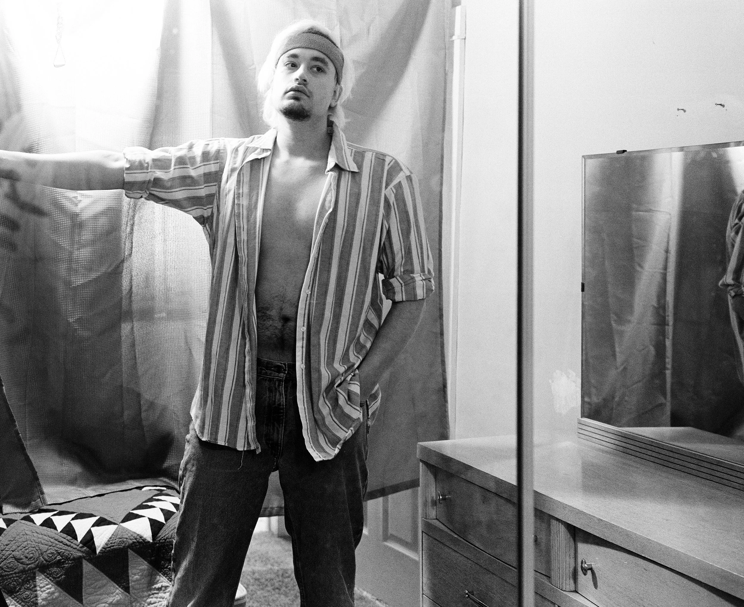 I then went to Rocky Gap Beach in Benton Harbor, where I had visited but, once again, never photographed before. It was freezing cold out on the windy beach, and the frozen ice and sand would have made compelling subjects, but the camera malfunctioned again! This time the winder didn’t catch for several frames, and then after it finally caught, I had run out of room on the film. When I developed this roll, I discovered that not only had I missed out on several frames, but nothing since the Atticus Finch had been recorded. I will have to go back to that beach, preferably on a slightly warmer day, and take more photos, I guess. So now I had shot two rolls, but I still couldn’t rule out my error or the weather playing a role in the winder not functioning properly. So, I decided to eliminate some variables on my third roll: shoot inside, to control temperature; shoot self-portraits on a tripod, to control the light settings, and use a cable release, to barely touch the camera at all during shooting. I set up some curtains in my guest bedroom, which has lots of mirrors, and got my friend Konnor to help me get the camera focused, and then I was good to go. Sunday morning, then, I had seven different outfits laid out, in case seven was the max number of shots I was ever going to get on this camera, and a roll of Tri-X 400 in the camera, so I could avoid the ugly color from the normal yellow light in the room.