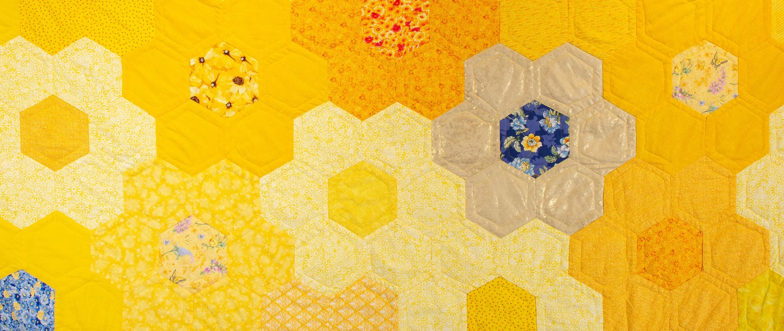 Wrap-around cover of Waking Dreams at High Noon. Photo represents part of the “Sunny” quilt made by my grandma, Alice Whitney.